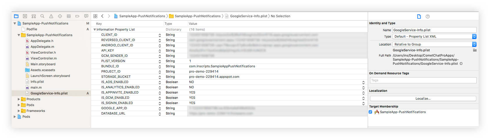- Download the GoogleService-Info.plist file and place it in the mentioned location of your project. Move your config file into the root of your Xcode project. If prompted, select to add the config file to all targets as follows.
