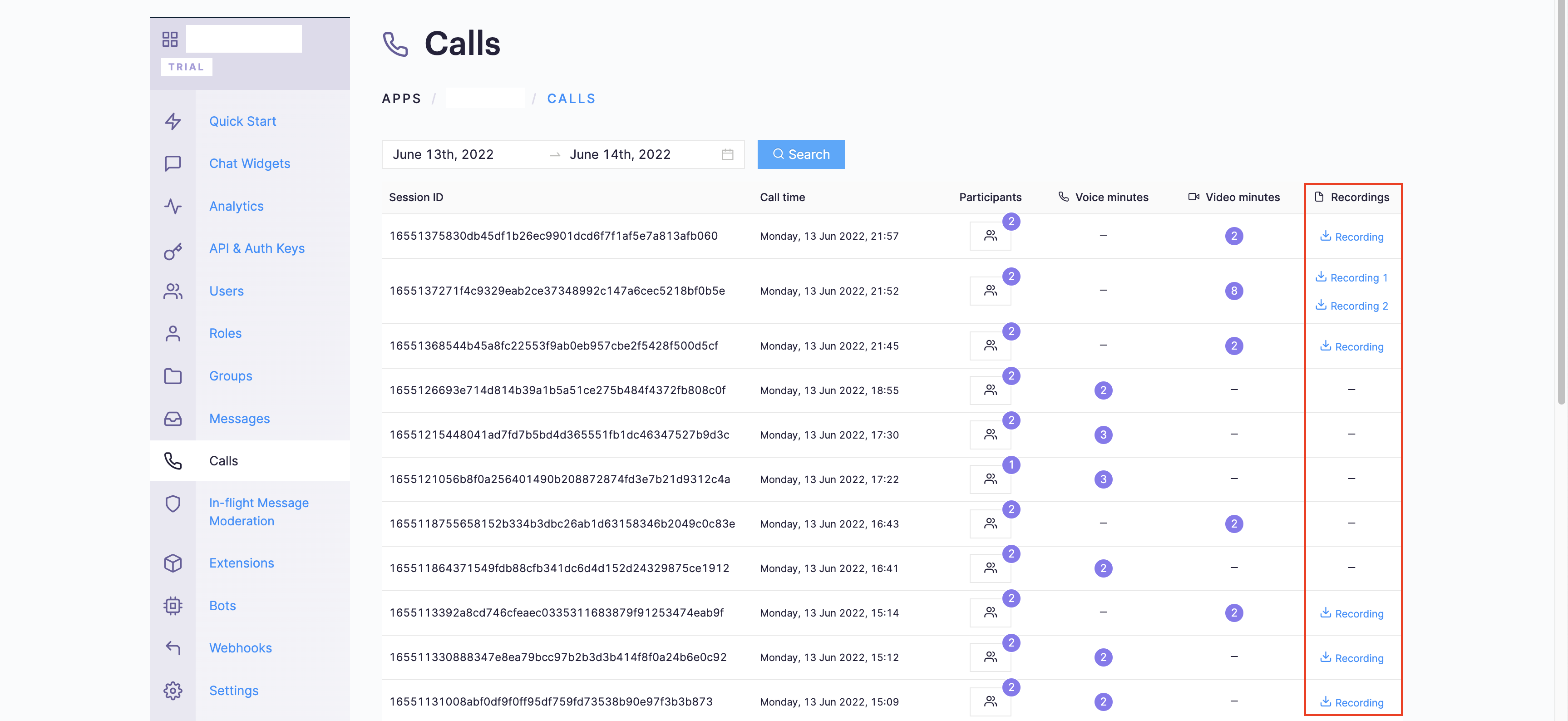 Currently, the call recordings are available on the CometChat Dashboard under the Calls Section. You can refer to the below screenshot.